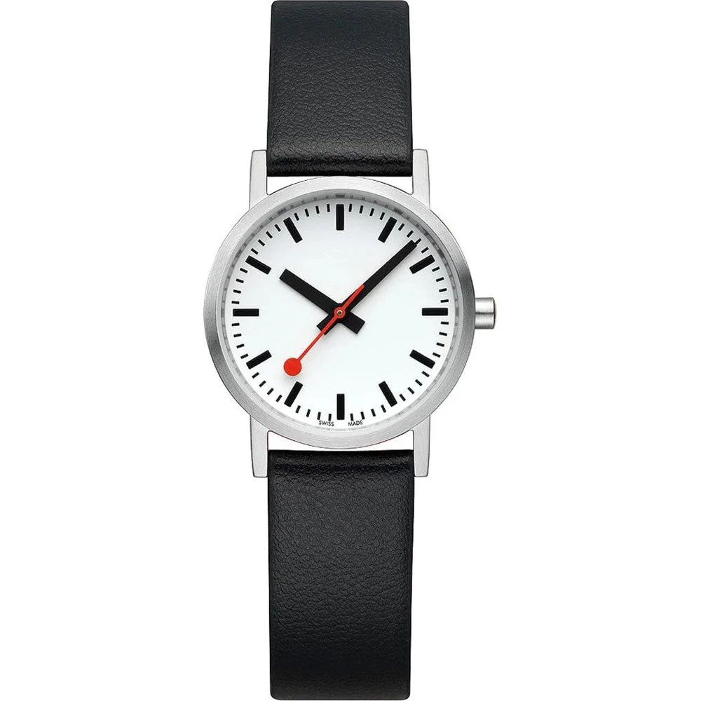 This Mondaine watch has a case made of stainless steel with a diameter of 30 mm and is fitted with a leather band. Inside the case lies a Ronda movement and the watch features a Mineral crystal.