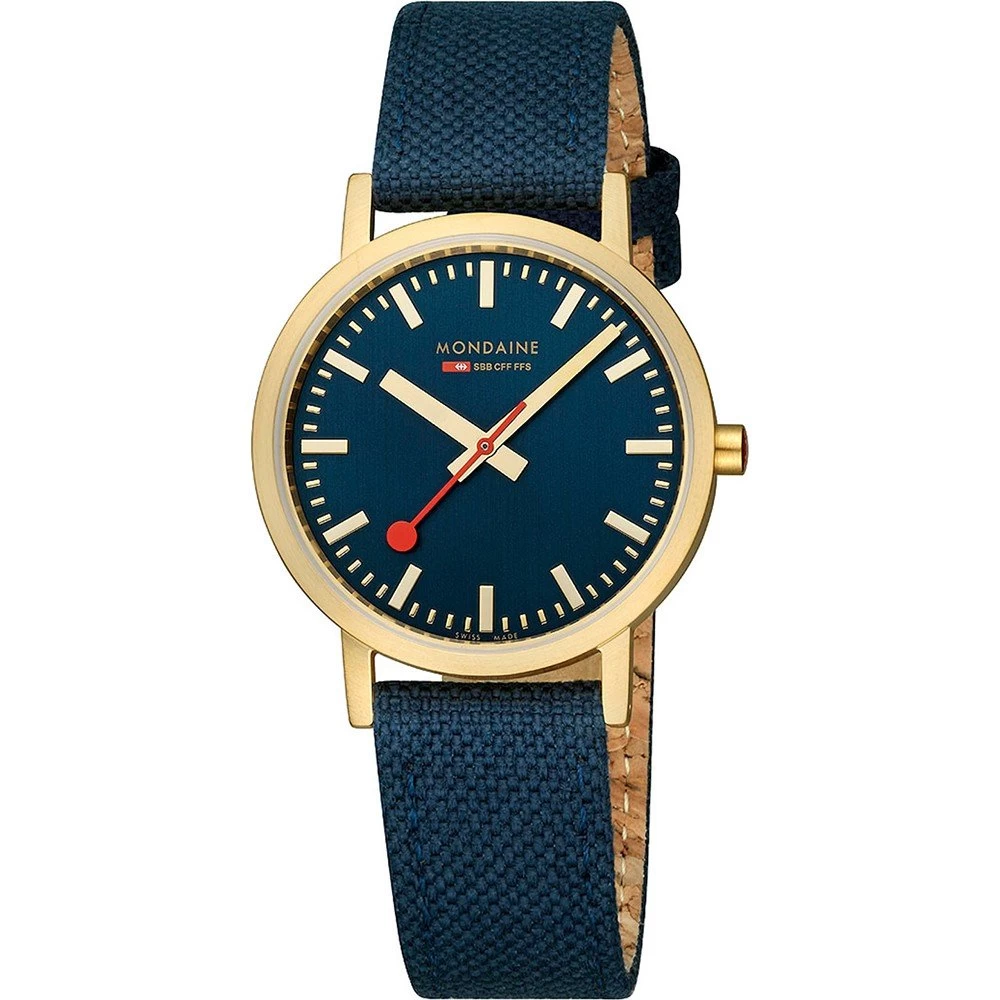 This Mondaine watch has a case made of stainless steel with a diameter of 36 mm and is fitted with a textile band. Inside the case lies a Ronda movement and the watch features a Mineral crystal.