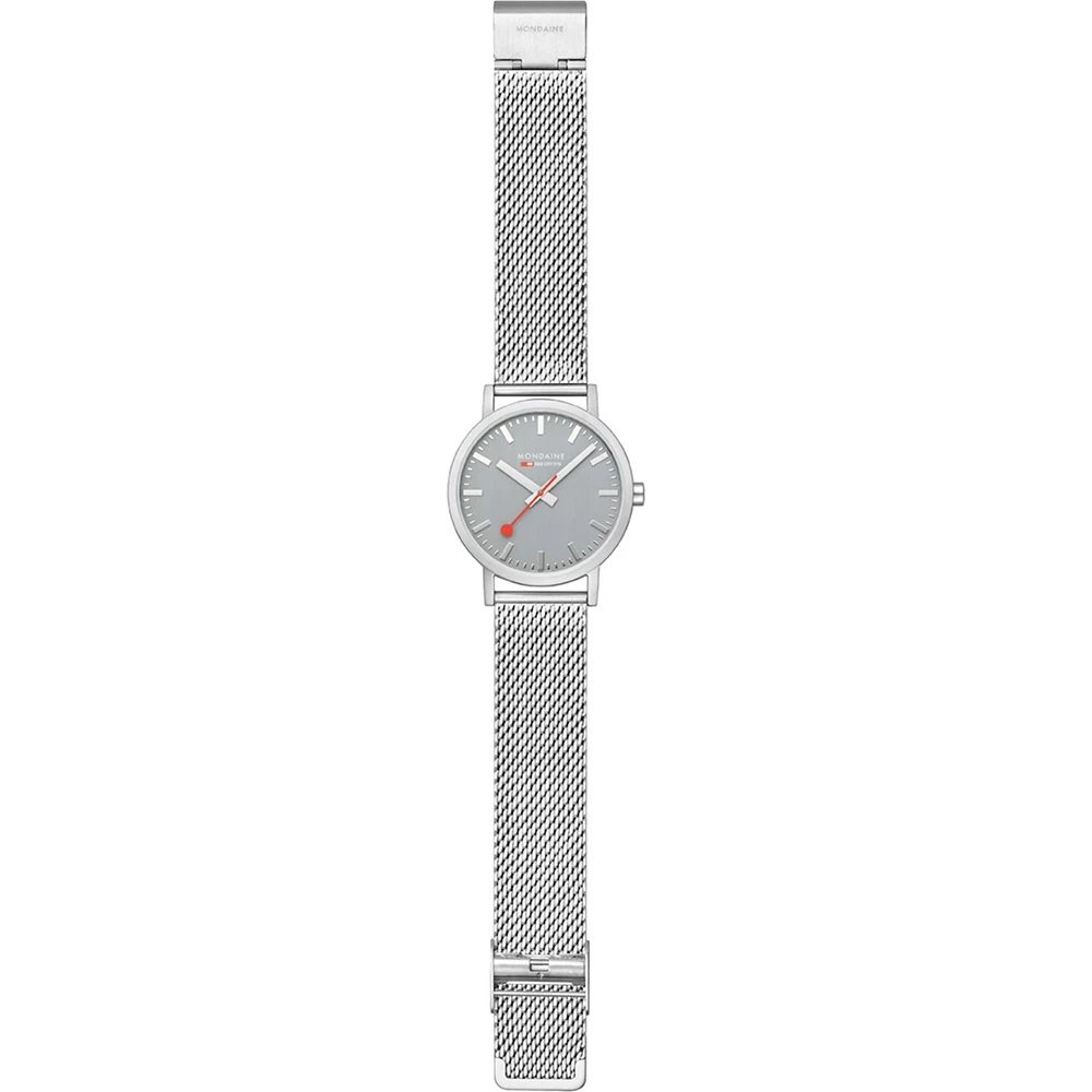 This Mondaine watch has a case made of stainless steel with a diameter of 40 mm and is fitted with a metal band. Inside the case lies a Ronda movement and the watch features a Mineral crystal.