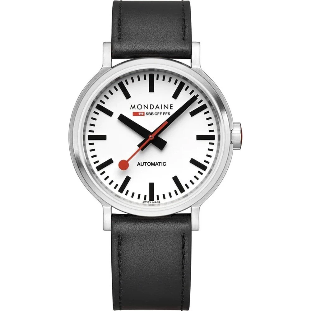 This Mondaine watch has a case made of stainless steel with a diameter of 41 mm and is fitted with a leather band. Inside the case lies a Sellita movement and the watch features a Sapphire crystal.