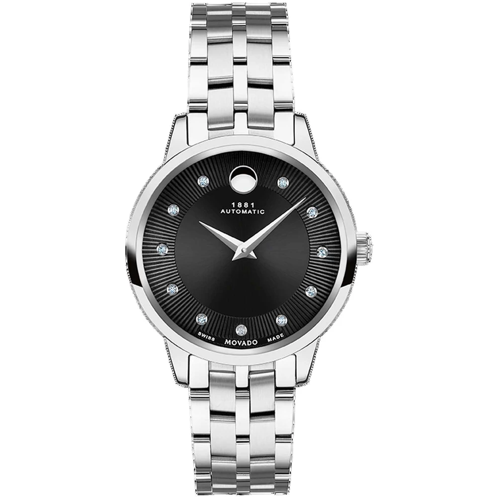 This Movado watch has a case made of stainless steel with a diameter of 30 mm and is fitted with a metal band. Inside the case lies a ETA movement and the watch features a Sapphire crystal.