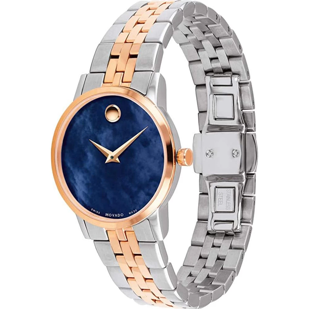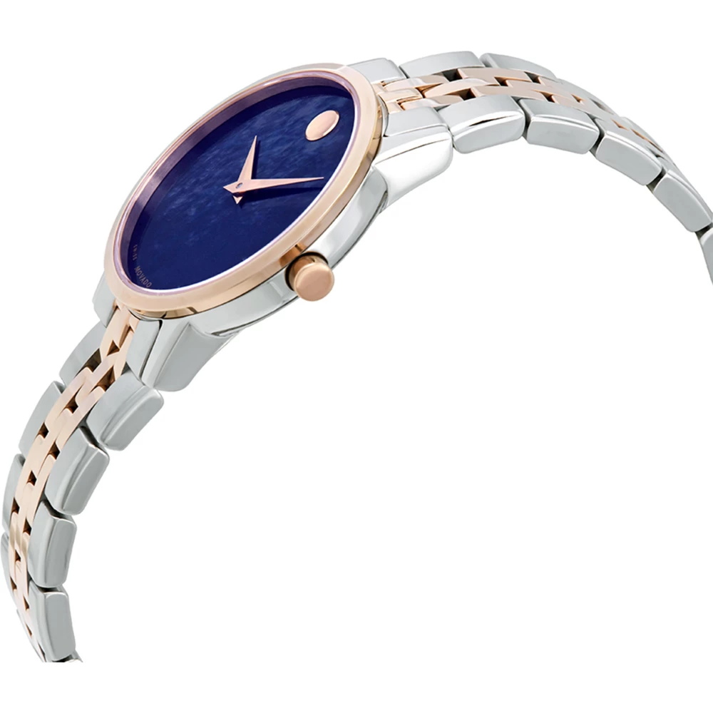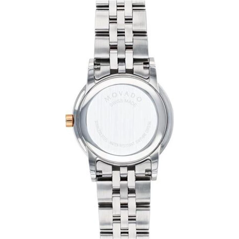 This Movado watch has a case made of stainless steel with a diameter of 28 mm and is fitted with a metal band. Inside the case lies a ETA movement and the watch features a Sapphire crystal.