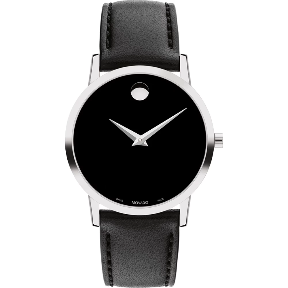 This Movado watch has a case made of stainless steel with a diameter of 33 mm and is fitted with a leather band. Inside the case lies a ETA movement and the watch features a Sapphire crystal.