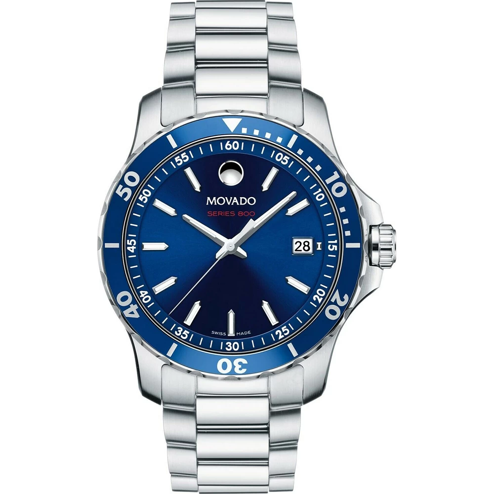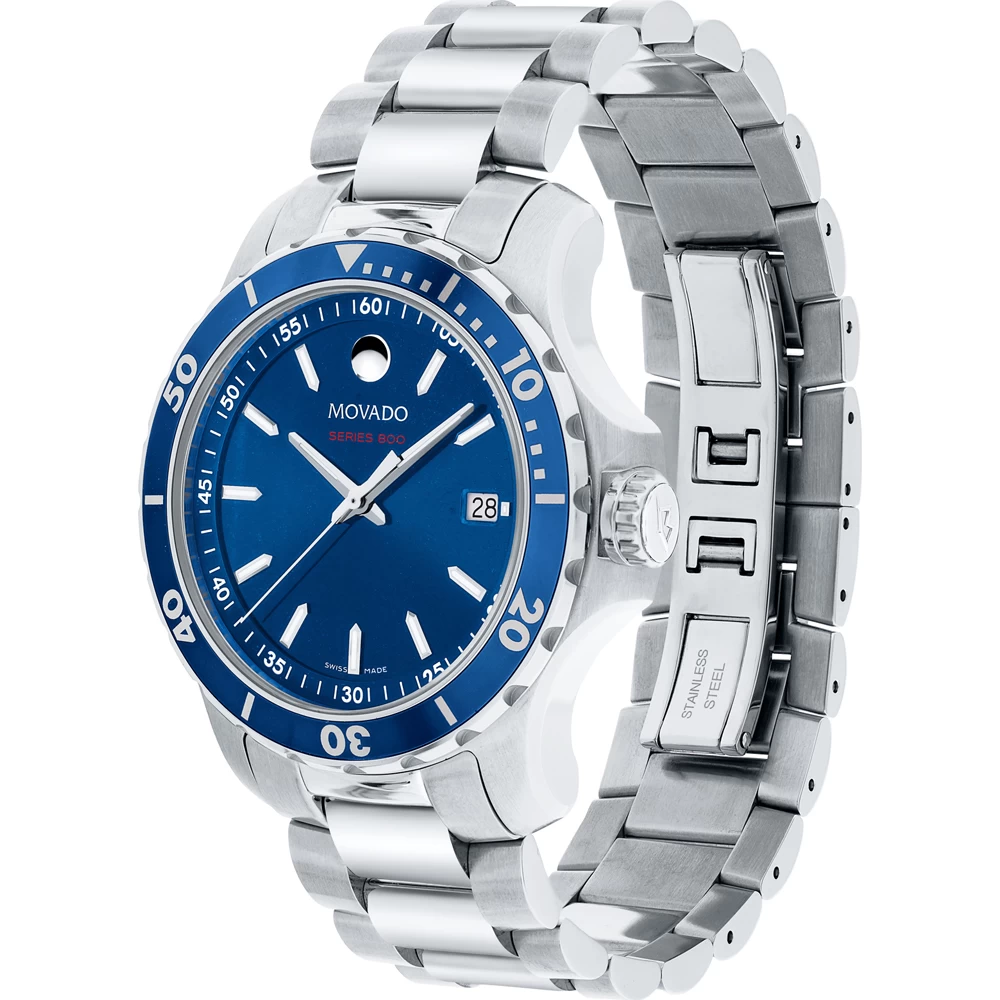 This Movado watch has a stainless steel case 40 mm in diameter and is fitted with a metal strap. Inside the case lies a Ronda movement and the watch features a Sapphire crystal.