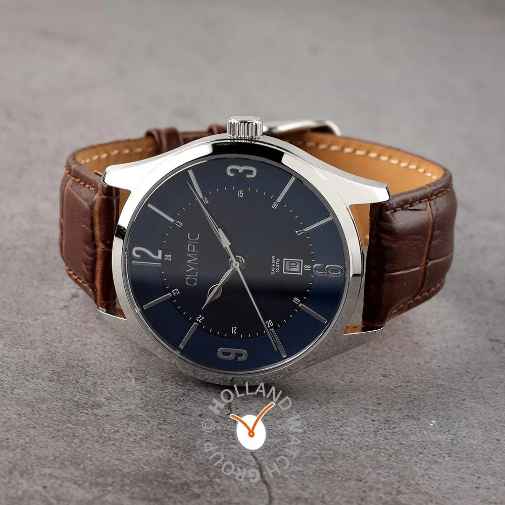 This Olympic watch has a case made of stainless steel with a diameter of 42 mm and is fitted with a leather band. Inside the case lies a Miyota movement and the watch features a Sapphire crystal.