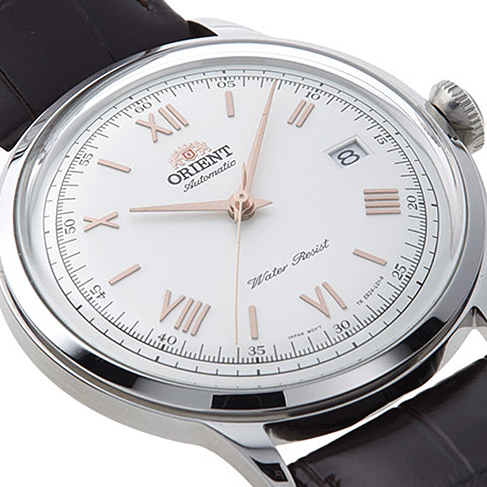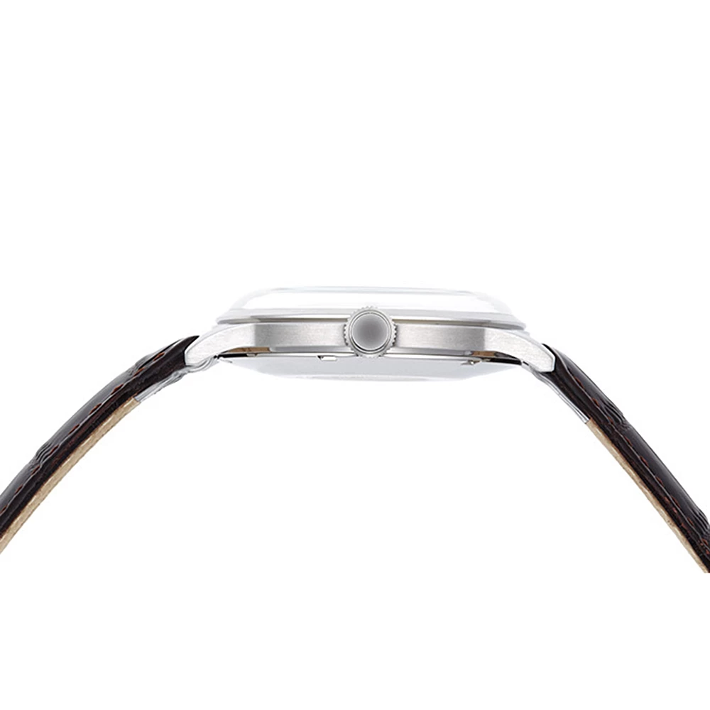 This Orient watch has a case made of stainless steel with a diameter of 40.5 mm and is fitted with a leather band. Inside the case lies a Orient movement and the watch features a Mineral crystal.
