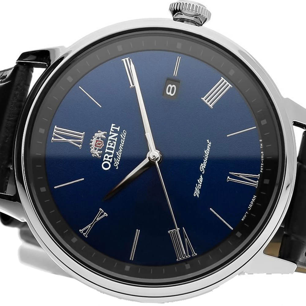 This Orient watch has a case made of stainless steel with a diameter of 42.4 mm and is fitted with a leather band. Inside the case lies a Orient movement and the watch features a Mineral crystal.
