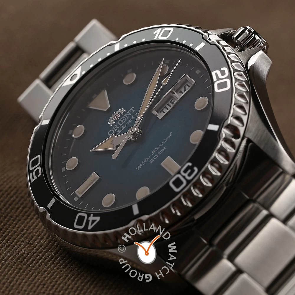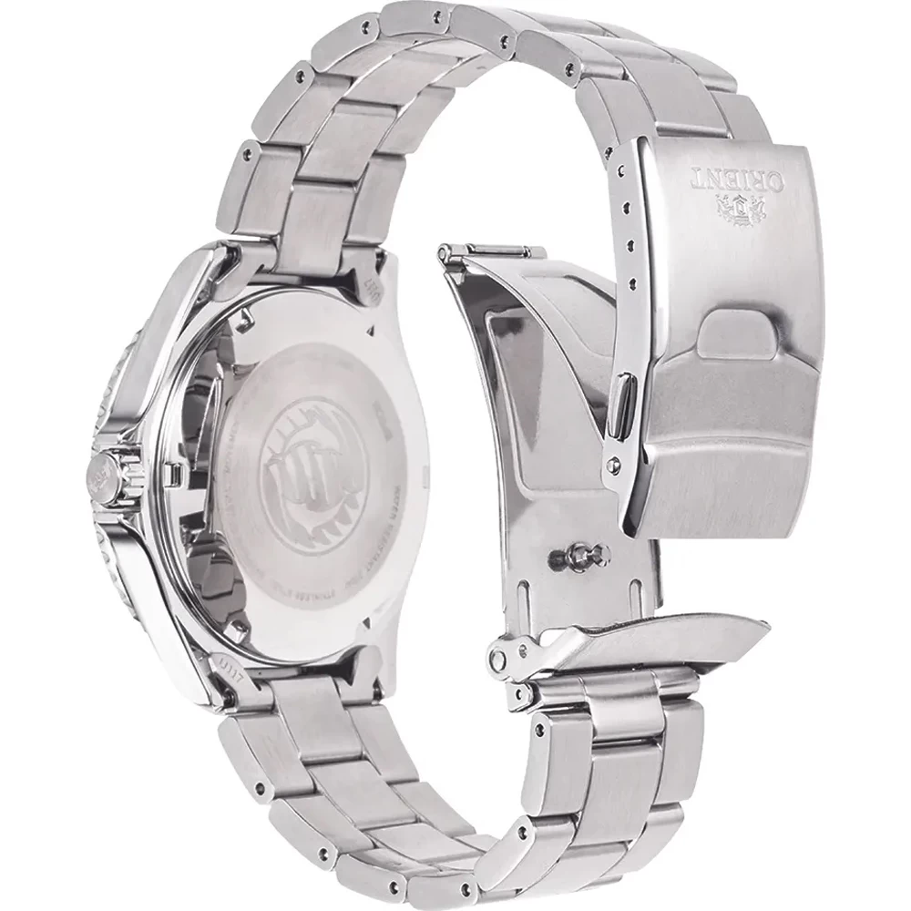 This Orient watch has a stainless steel case 41.8 mm in diameter and is fitted with a metal strap. Inside the case lies a Orient movement and the watch features a Sapphire crystal.