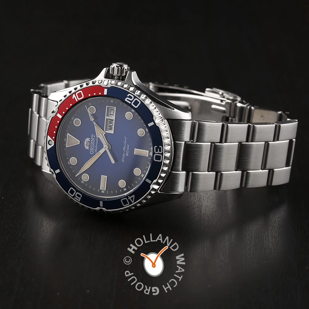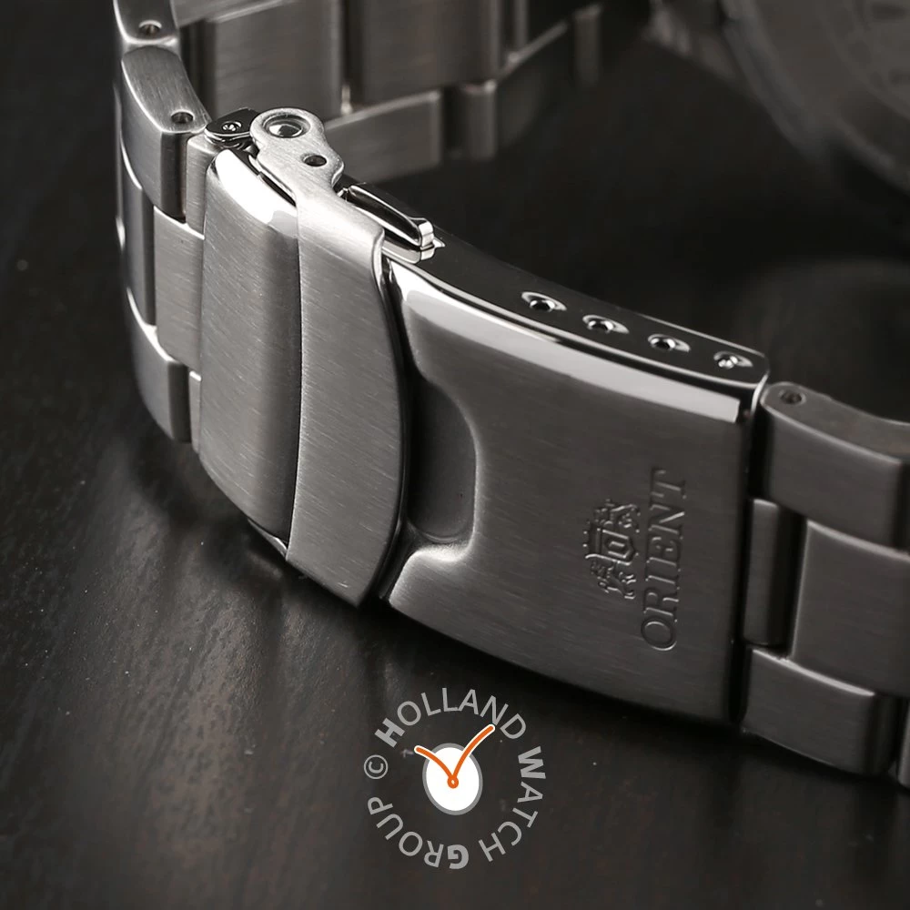 This Orient watch has a stainless steel case 41.8 mm in diameter and is fitted with a metal strap. Inside the case lies a Orient movement and the watch features a Sapphire crystal.