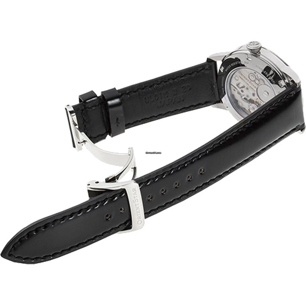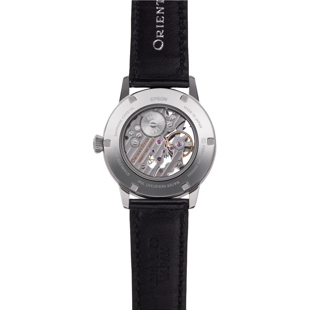 This Orient watch has a case made of stainless steel with a diameter of 38.8 mm and is fitted with a leather band. Inside the case lies a Orient movement and the watch features a Sapphire crystal.