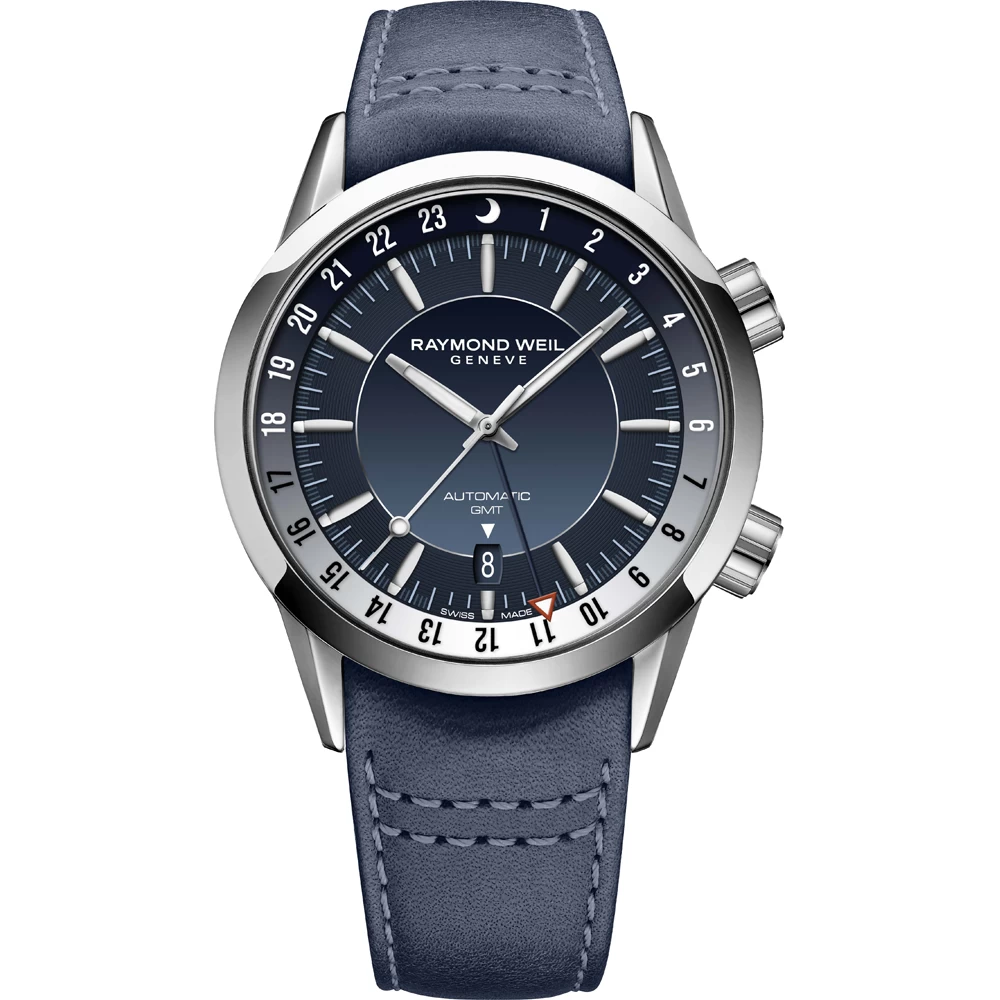 This Raymond Weil watch has a case made of stainless steel with a diameter of 40.5 mm and is fitted with a leather band. Inside the case lies a Sellita movement and the watch features a Sapphire crystal.