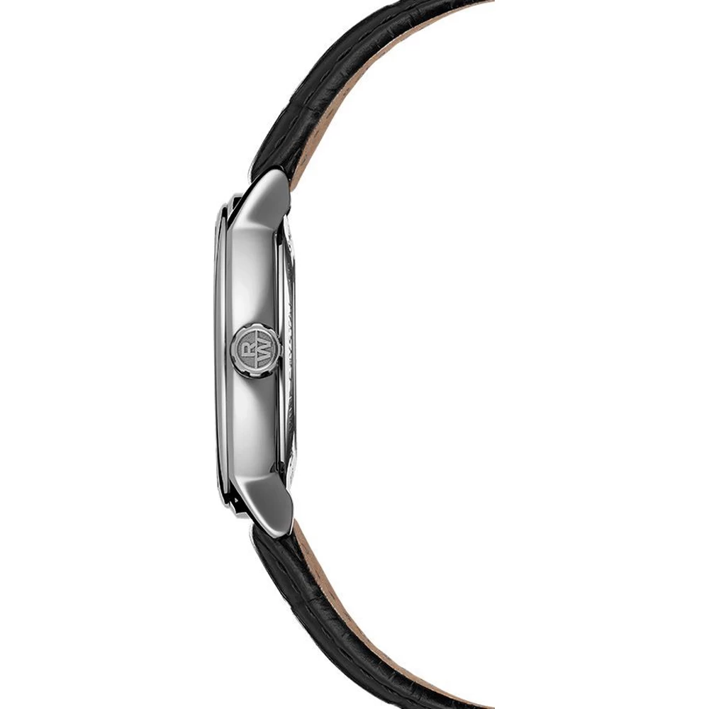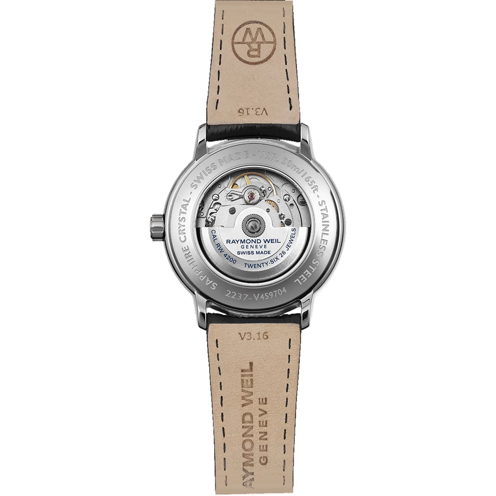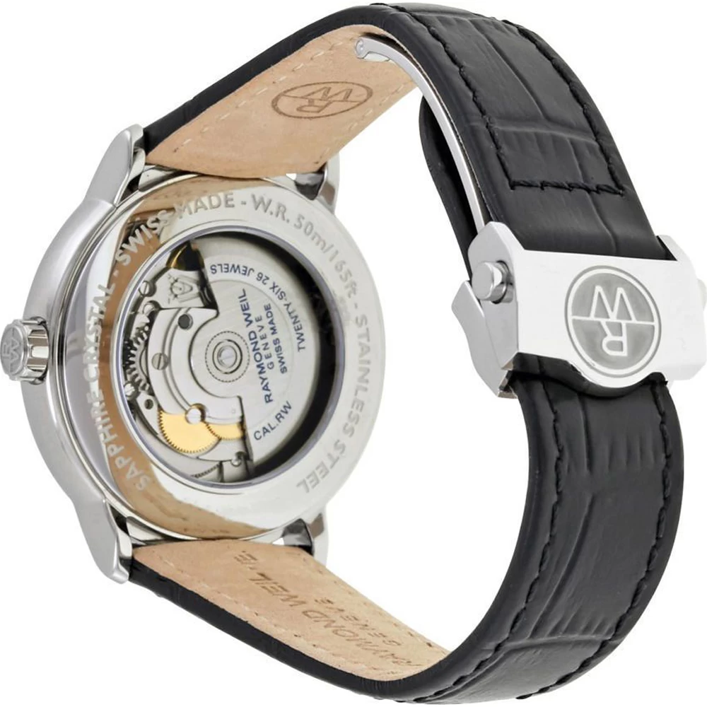 This Raymond Weil watch has a case made of stainless steel with a diameter of 39.5 mm and is fitted with a leather band. Inside the case lies a Sellita movement and the watch features a Sapphire crystal.