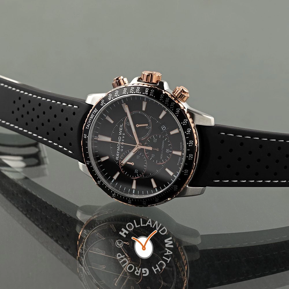 This Raymond Weil watch has a case made of stainless steel with a diameter of 43 mm and is fitted with a rubber band. Inside the case lies a Ronda movement and the watch features a Sapphire crystal.