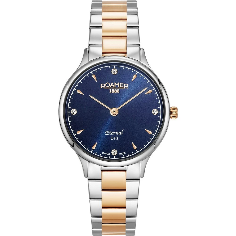 This Roamer watch has a case made of stainless steel with a diameter of 30 mm and is fitted with a metal band. Inside the case lies a Ronda movement and the watch features a Single anti-reflective sapphire crystal.