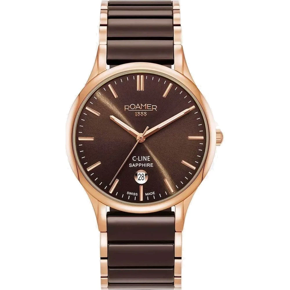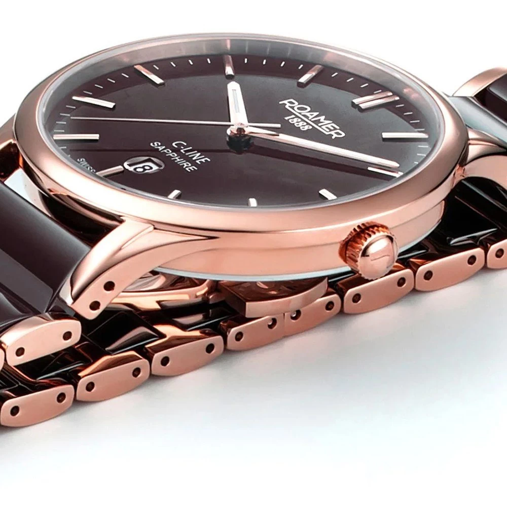 This Roamer watch has a case made of stainless steel with a diameter of 40 mm and is fitted with a ceramic band. Inside the case lies a Ronda movement and the watch features a Sapphire crystal.