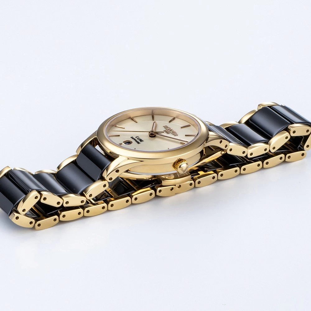 This Roamer watch has a case made of stainless steel with a diameter of 30 mm and is fitted with a ceramic band. Inside the case lies a Ronda movement and the watch features a Sapphire crystal.