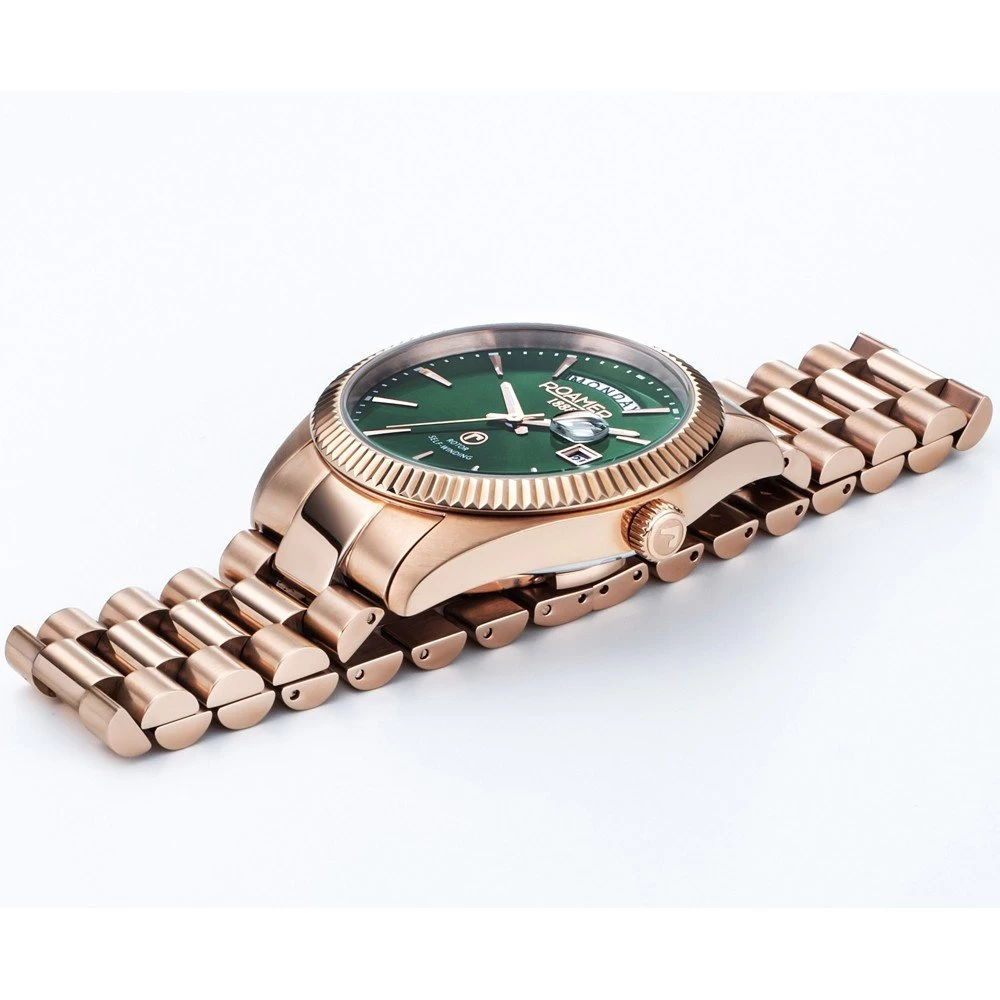 The watch is 5 ATM. This means the watch is suitable for showering. The watch comes with Roamer 2+5.