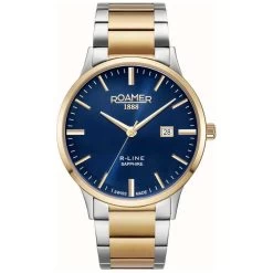 This Roamer watch has a case made of stainless steel with a diameter of 43 mm and is fitted with a metal band. Inside the case lies a Ronda movement and the watch features a Sapphire crystal.
