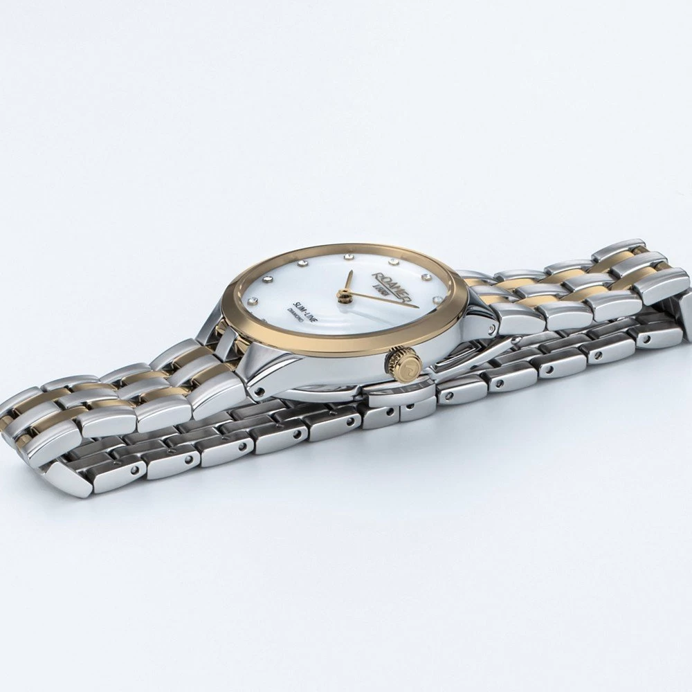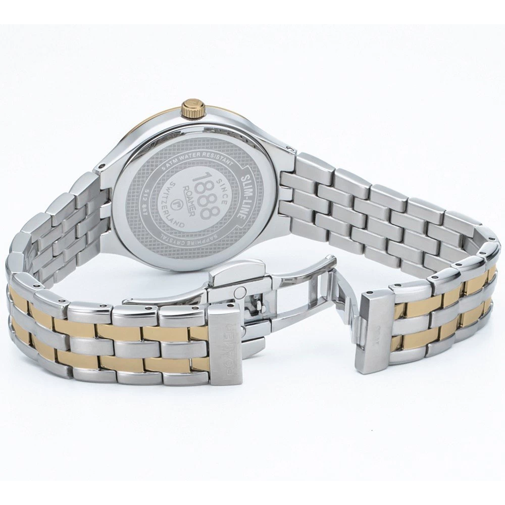 This Roamer watch has a case made of stainless steel with a diameter of 30 mm and is fitted with a metal band. Inside the case lies a Ronda movement and the watch features a Sapphire crystal.