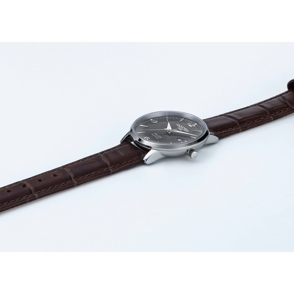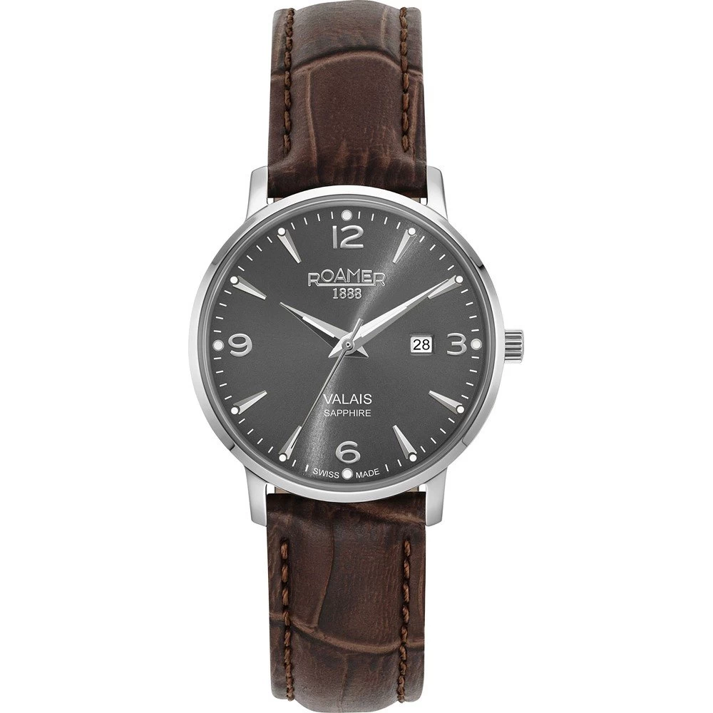 This Roamer watch has a case made of stainless steel with a diameter of 32 mm and is fitted with a leather band. Inside the case lies a Ronda movement and the watch features a Sapphire crystal.