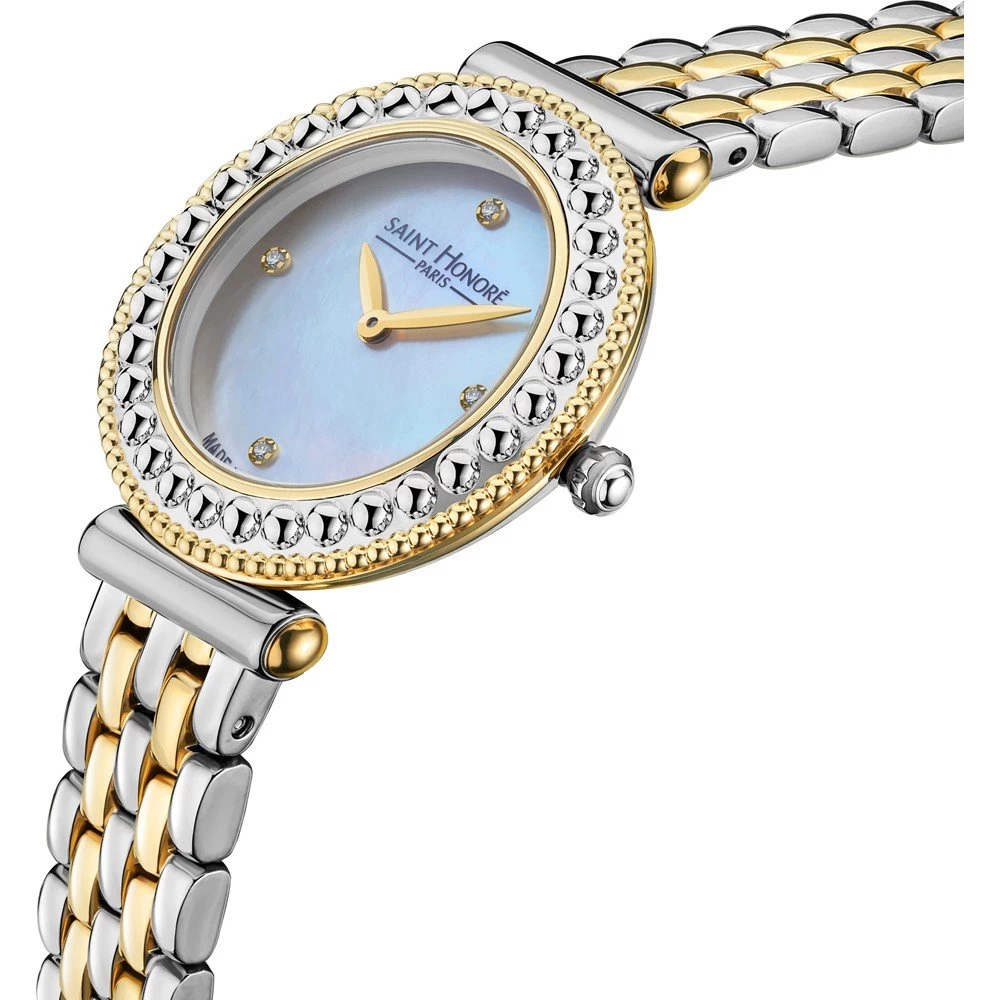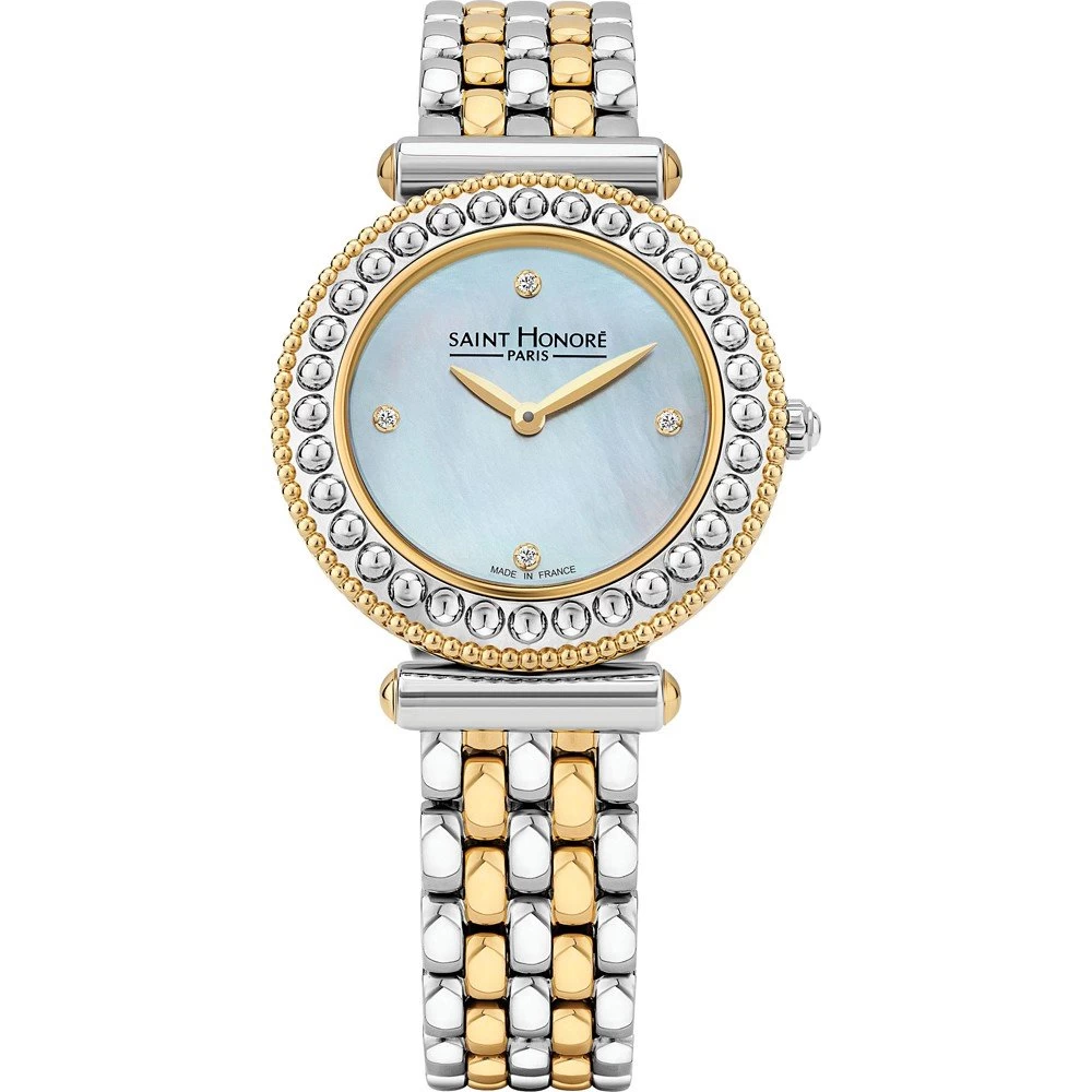 This Saint Honoré watch has a case made of stainless steel with a diameter of 29 mm and is fitted with a metal band. Inside the case lies a Ronda movement and the watch features a Sapphire crystal.