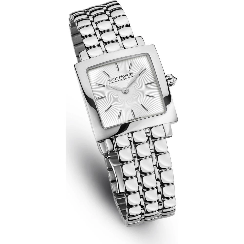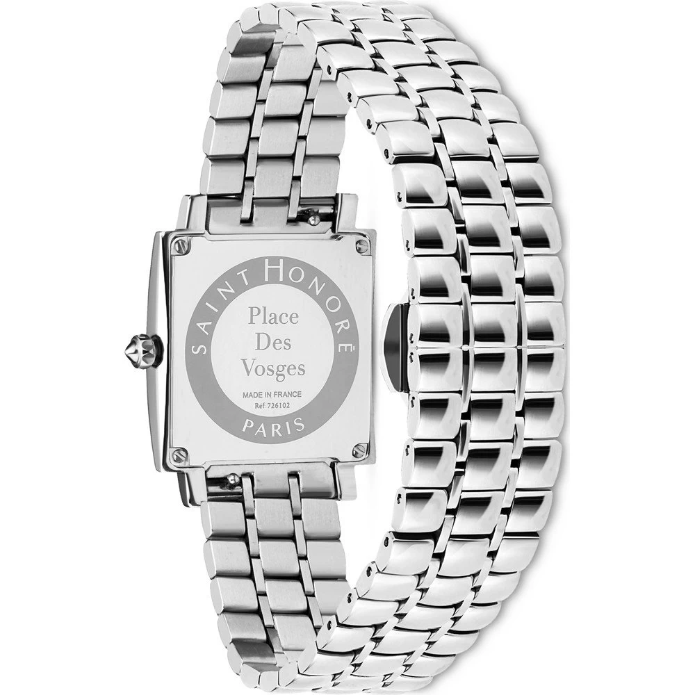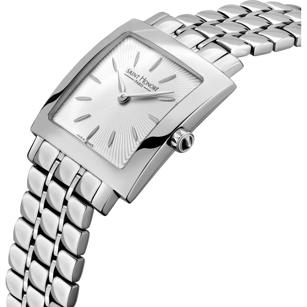 This Saint Honoré watch has a case made of stainless steel with a diameter of 26 mm and is fitted with a metal band. Inside the case lies a Ronda movement and the watch features a Sapphire crystal.