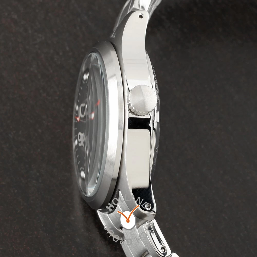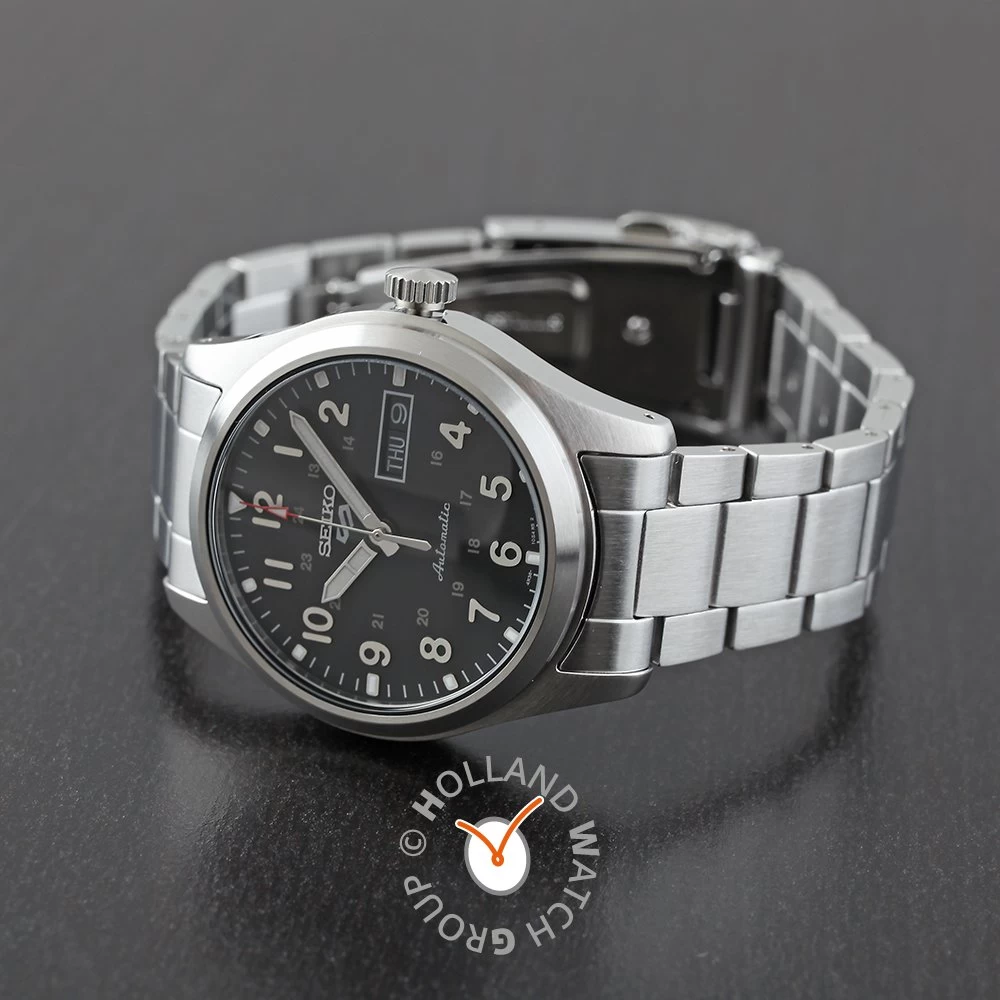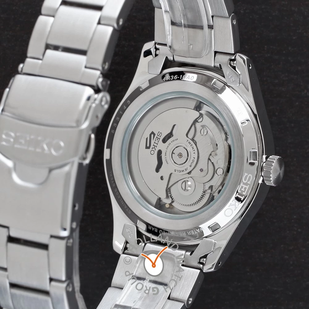 This Seiko watch has a case made of stainless steel with a diameter of 39.4 mm and is fitted with a metal band. Inside the case lies a Seiko movement and the watch features a Mineral crystal.