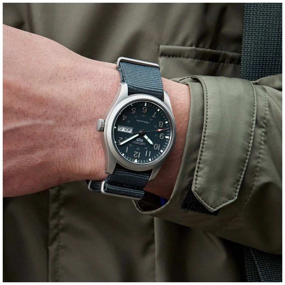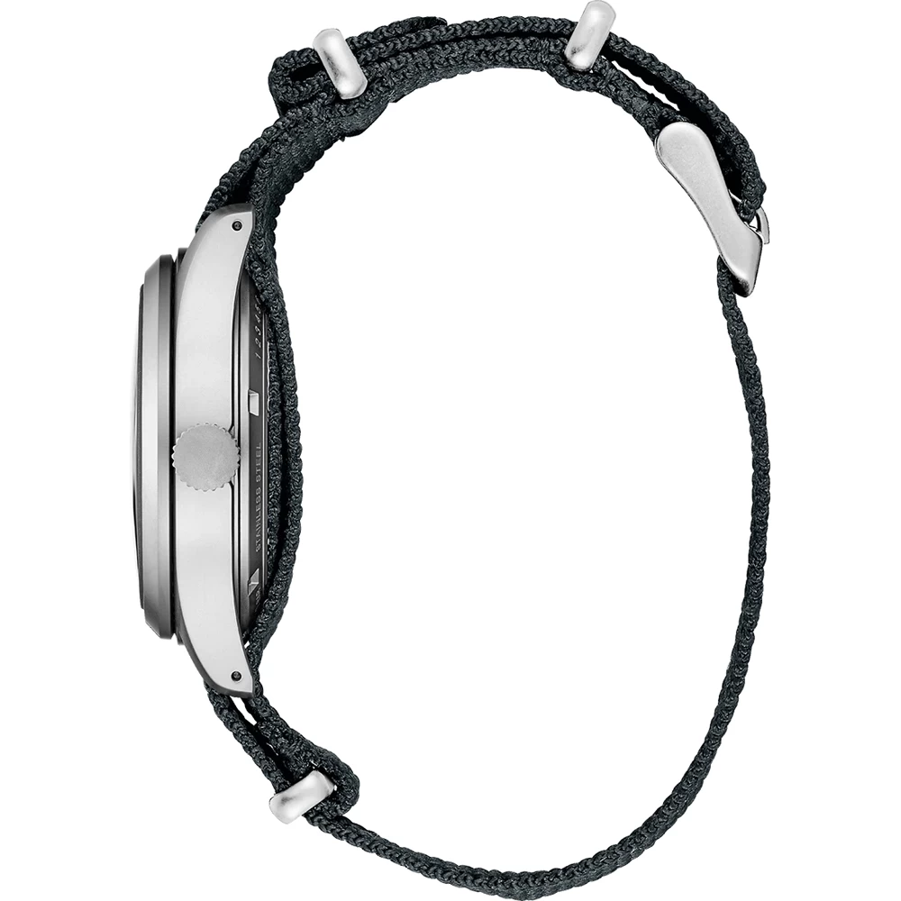 This Seiko watch has a case made of stainless steel with a diameter of 39.4 mm and is fitted with a textile band. Inside the case lies a Seiko movement and the watch features a Mineral crystal.