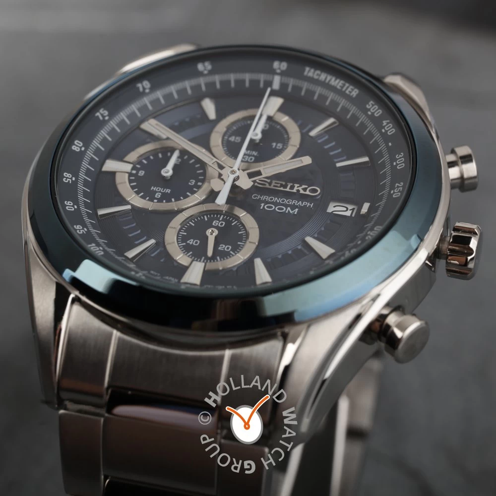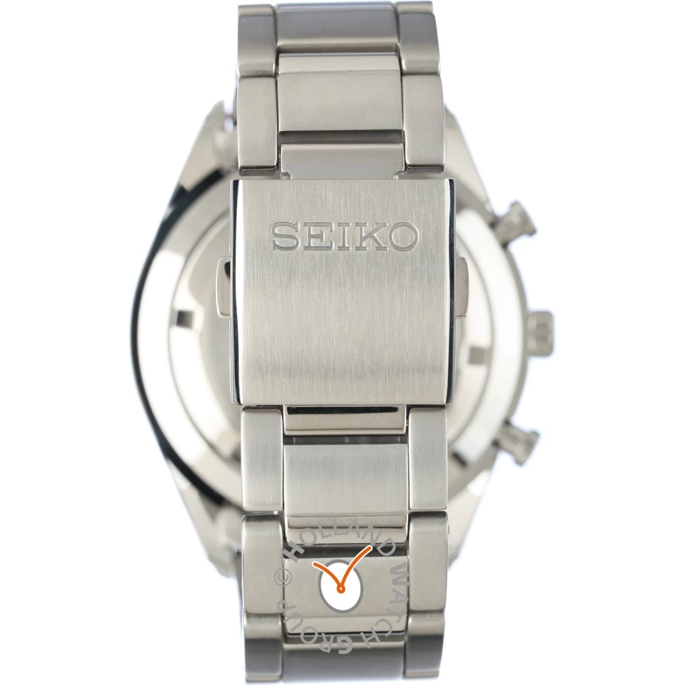 This Seiko watch has a case made of stainless steel with a diameter of 44.9 mm and is fitted with a metal band. Inside the case lies a Seiko movement and the watch features a Mineral crystal.