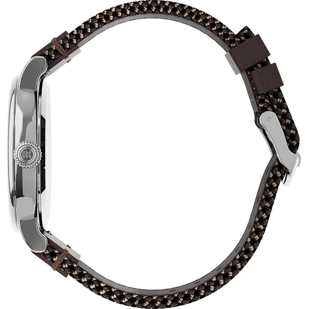 This Timex watch has a case made of stainless steel with a diameter of 40 mm and is fitted with a textile band. Inside the case lies a Timex movement and the watch features a Mineral crystal.