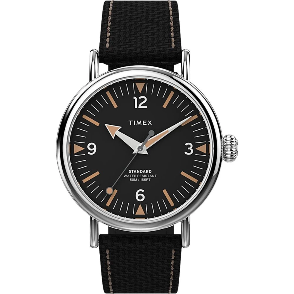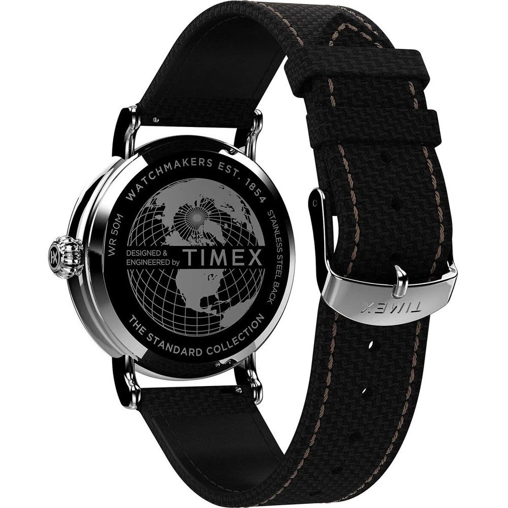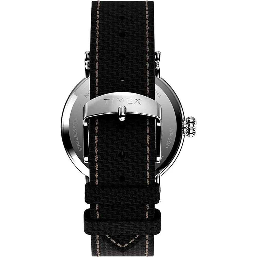 This Timex watch has a case made of stainless steel with a diameter of 40 mm and is fitted with a Textile over leather band. Inside the case lies a Timex movement and the watch features a Mineral crystal.