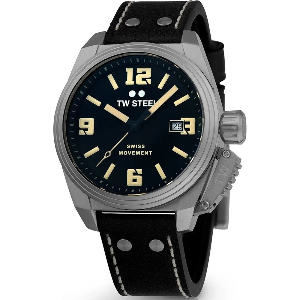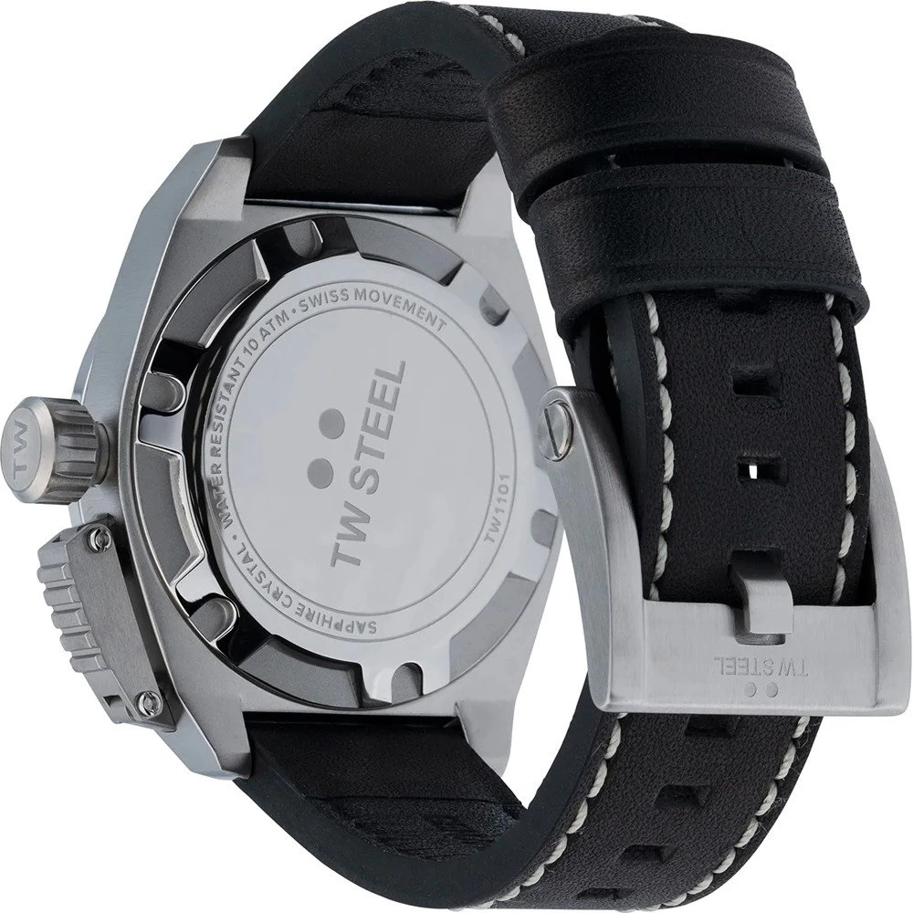 This TW Steel watch has a case made of stainless steel with a diameter of 42 mm and is fitted with a leather band. Inside the case lies a Ronda movement and the watch features a Sapphire crystal.