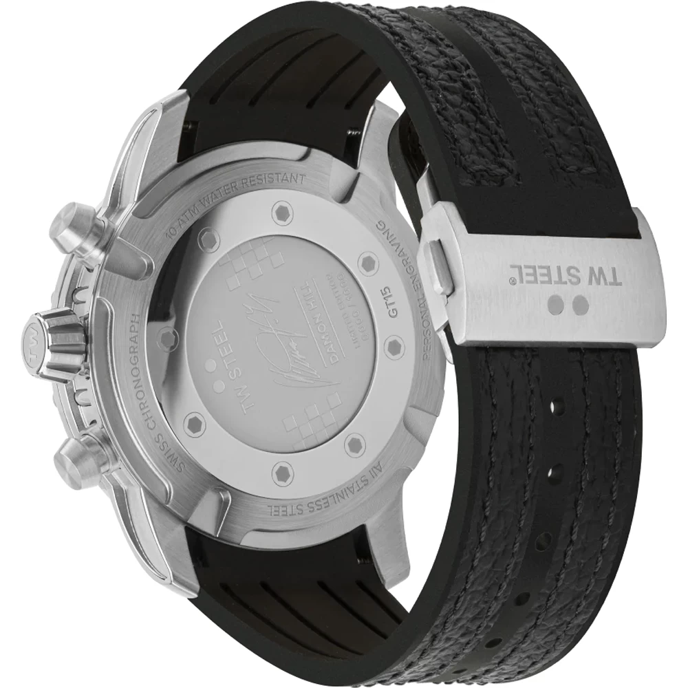 This TW Steel watch has a case made of stainless steel with a diameter of 47 mm and is fitted with a Leather over silicone band. Inside the case lies a Ronda movement and the watch features a Single anti-reflective sapphire crystal.