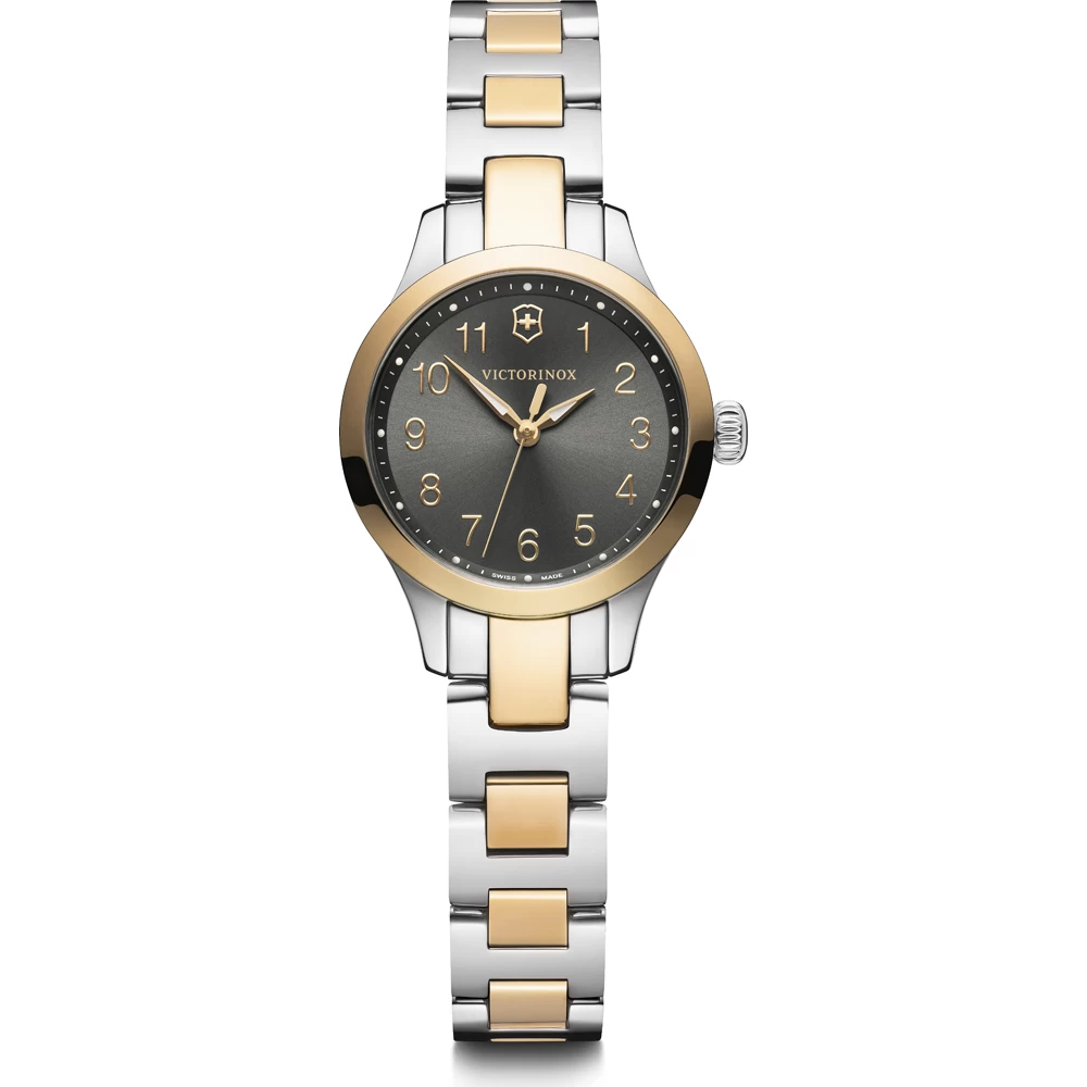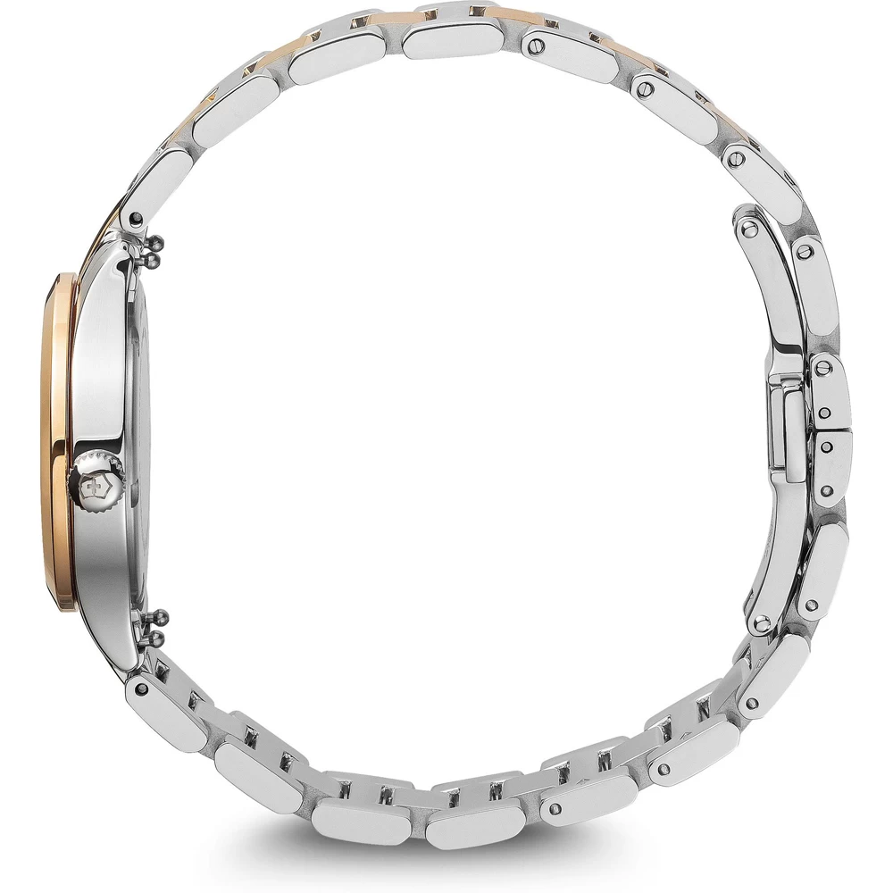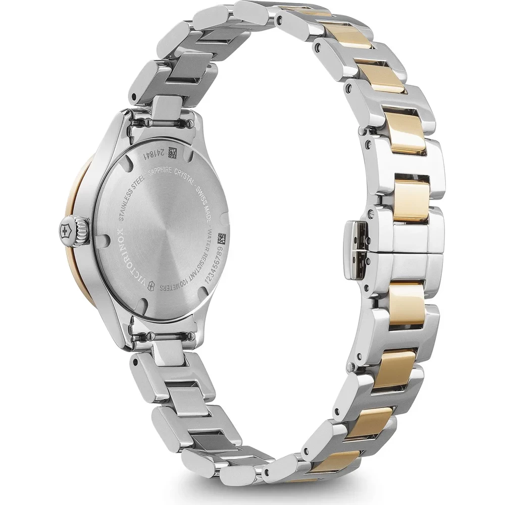 This Victorinox Swiss Army watch has a case made of stainless steel with a diameter of 28 mm and is fitted with a metal band. Inside the case lies a Ronda movement and the watch features a Sapphire crystal.