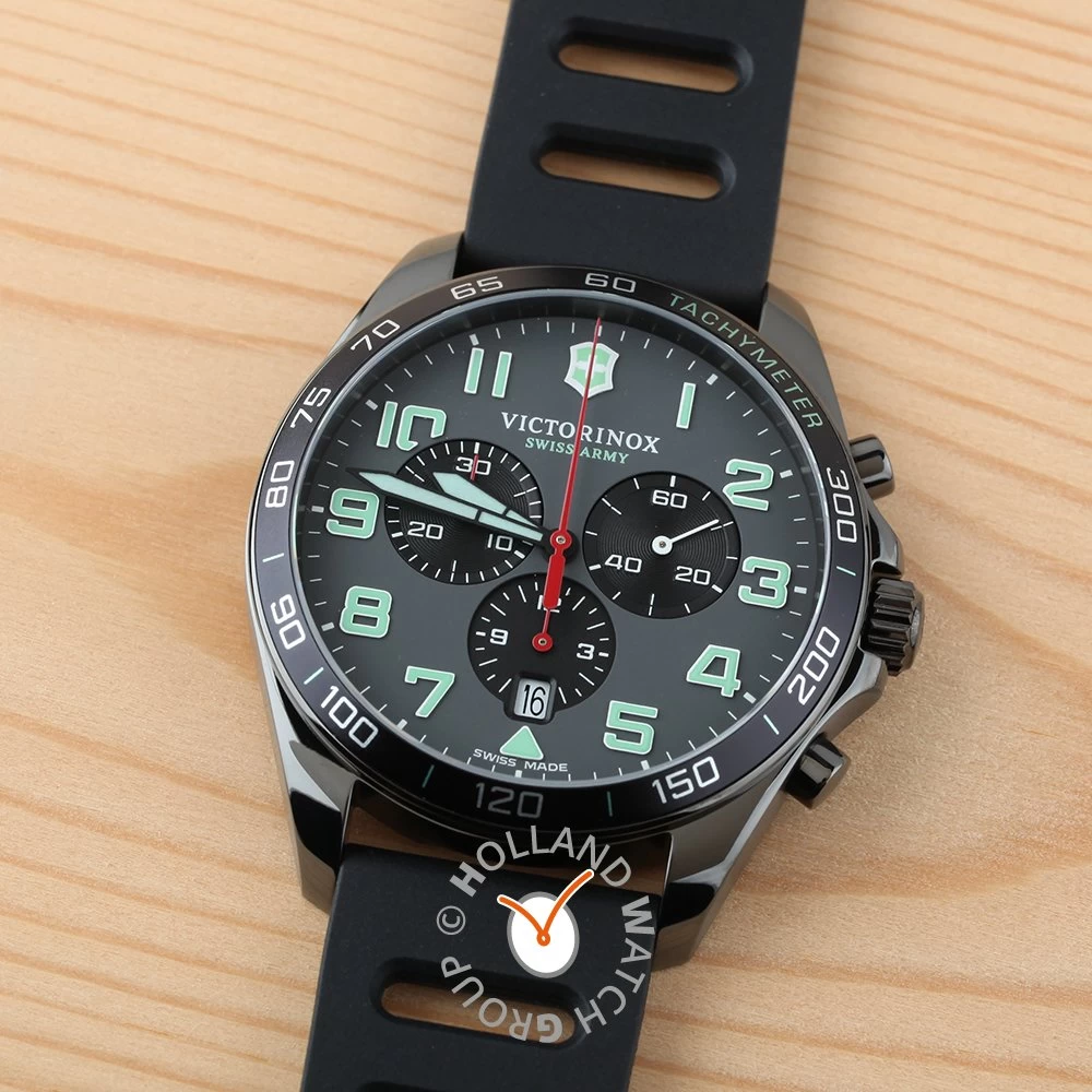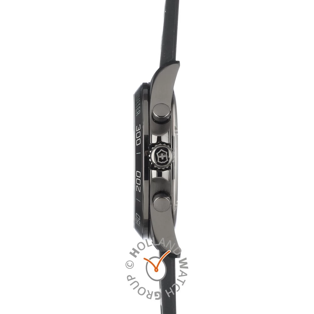 This Victorinox Swiss Army watch has a case made of stainless steel with a diameter of 42 mm and is fitted with a rubber band. Inside the case lies a Ronda movement and the watch features a Sapphire crystal.