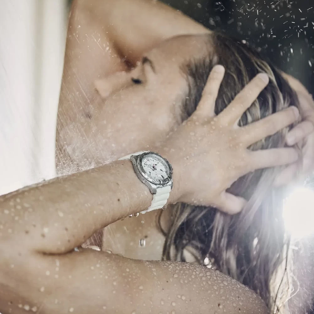 The watch is 10 ATM. This means the watch is suitable for swimming. The watch comes with 5 Year Warranty.