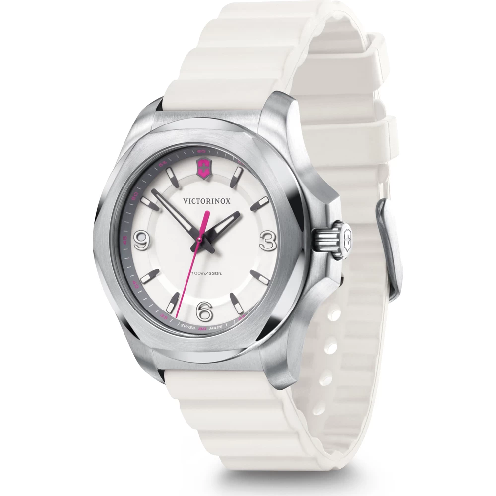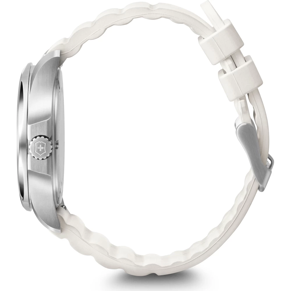This Victorinox Swiss Army watch has a case made of stainless steel with a diameter of 37 mm and is fitted with a rubber band. Inside the case lies a Ronda movement and the watch features a Sapphire crystal.