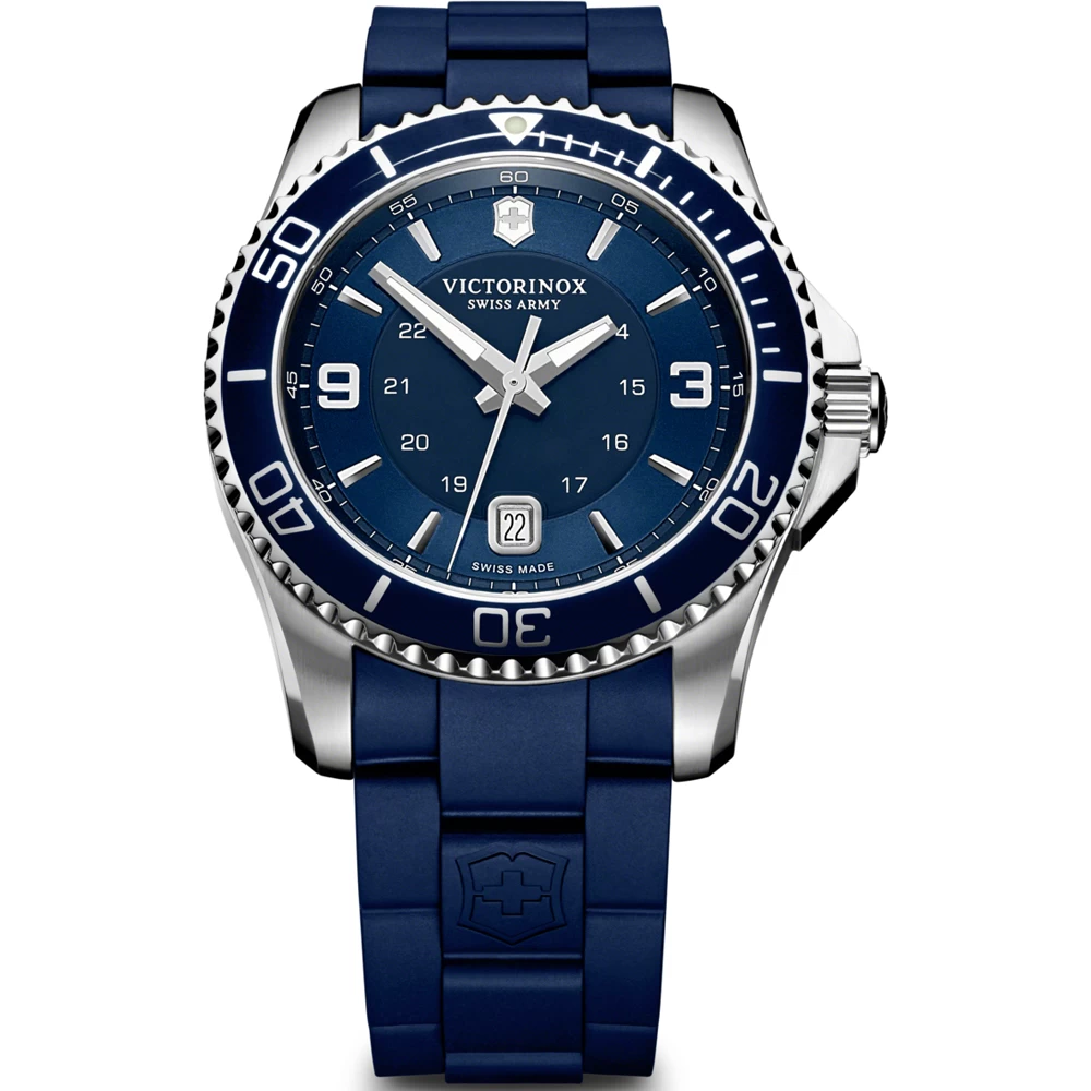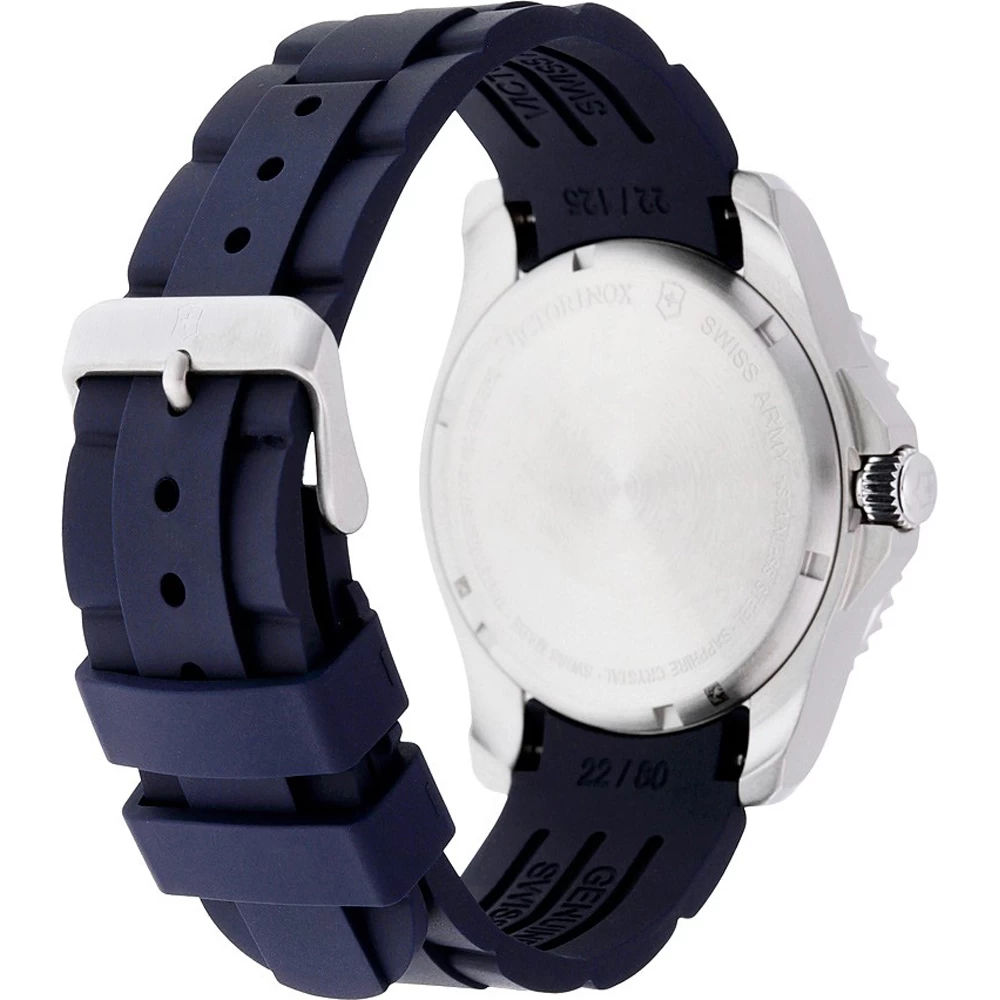 This Victorinox Swiss Army watch has a case made of stainless steel with a diameter of 43 mm and is fitted with a rubber band. Inside the case lies a Ronda movement and the watch features a Sapphire crystal.