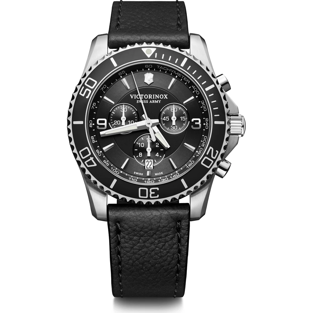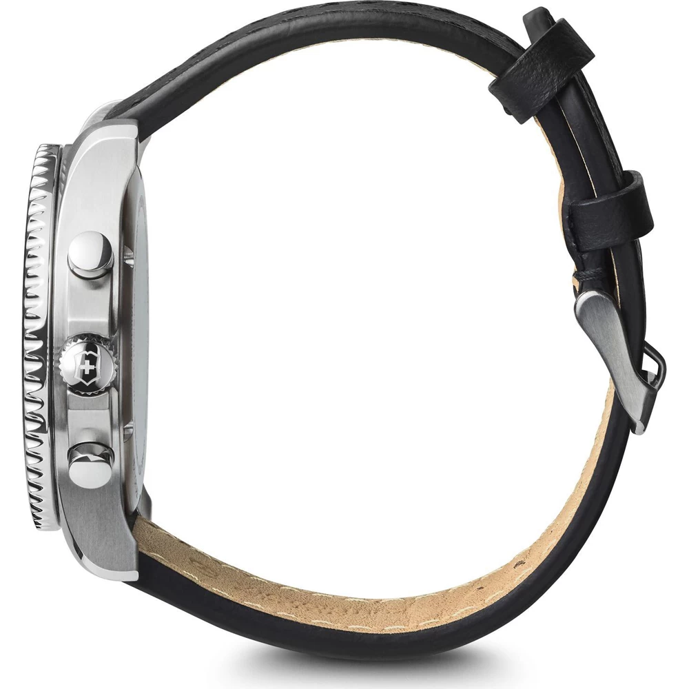 This Victorinox Swiss Army watch has a case made of stainless steel with a diameter of 43 mm and is fitted with a leather band. Inside the case lies a Ronda movement and the watch features a Sapphire crystal.
